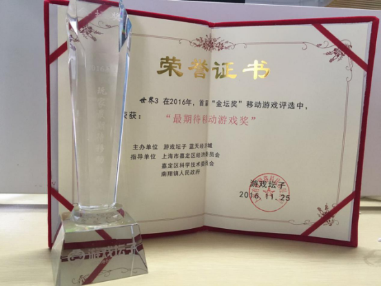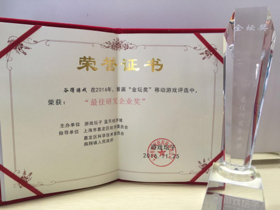 由游戲壇子、藍天經濟城聯合主辦,業內資深專家以及相關政府機構指導舉辦的2016年度金壇獎移動游戲評選活動頒獎典禮11月25日在上海舉辦。谷得游戲在本次評選中斬獲“最佳企業研發獎”,旗下游戲《銀河掠奪者》、《世界3》分別獲得“最具創意移動游戲獎”及“最期待移動游戲獎”共三項大獎。