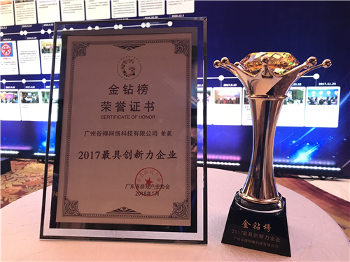 2018年1月19日,由廣東省文化廳指導、廣東省游戲產業協會主辦的廣東游戲產業年會頒獎典禮在廣州香格里拉酒店隆重舉行,谷得游戲榮膺“優秀企業獎”和“最具創新力企業”雙重大獎。