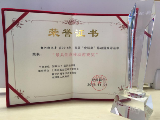 由游戲壇子、藍天經濟城聯合主辦,業內資深專家以及相關政府機構指導舉辦的2016年度金壇獎移動游戲評選活動頒獎典禮11月25日在上海舉辦。谷得游戲在本次評選中斬獲“最佳企業研發獎”,旗下游戲《銀河掠奪者》、《世界3》分別獲得“最具創意移動游戲獎”及“最期待移動游戲獎”共三項大獎。