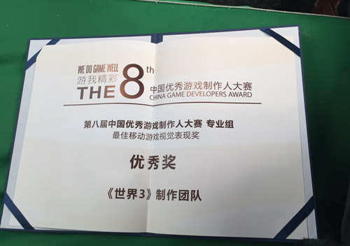 CGDA中國優秀制作人大賽自2009年起已經連續舉辦八年,涵蓋了程序、美術、策劃、動畫、音樂音效等游戲研發的重要領域,致力于推動中國游戲人才儲備、選拔和表彰優秀游戲制作人以及團隊。CGDA評委團由全球頂尖的游戲公司和院校的專家組成,經過專業評析推選出專業組和非專業組各類獎項,是目前國內游戲研發領域中專業性和含金量最高的評選比賽。《世界3》團隊最終通過評委團的層層評選,獲得專業組“最佳移動游戲視覺表現獎”優秀獎實屬不易。