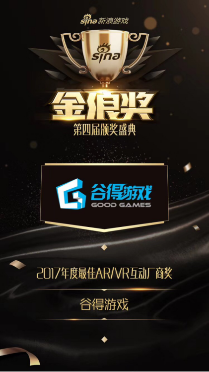 2018年4月18日,由新浪游戲主辦的2017年度“CGWR新浪中國游戲排行榜暨第四屆金浪獎頒獎典禮”在北京·國家會議中心隆重舉行。谷得游戲旗下“VR+樂園”憑借強大的研發技術能力、高品質的游戲體驗、創新的運營理念,榮膺“2017年度最佳AR/VR互動廠商獎”。此次,谷得游戲聯合創始人羅維出席頒獎典禮并發表致辭,以感謝新浪游戲。